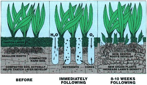 - Favorece la liberación de los gases tóxicos (Dióxido de carbono, metano, monóxido de carbono) que se acumulan en la zona radical como consecuencia de la actividad biológica que se produce en el suelo y que en altas concentraciones afectan negativamente el desempeño de la grama.
